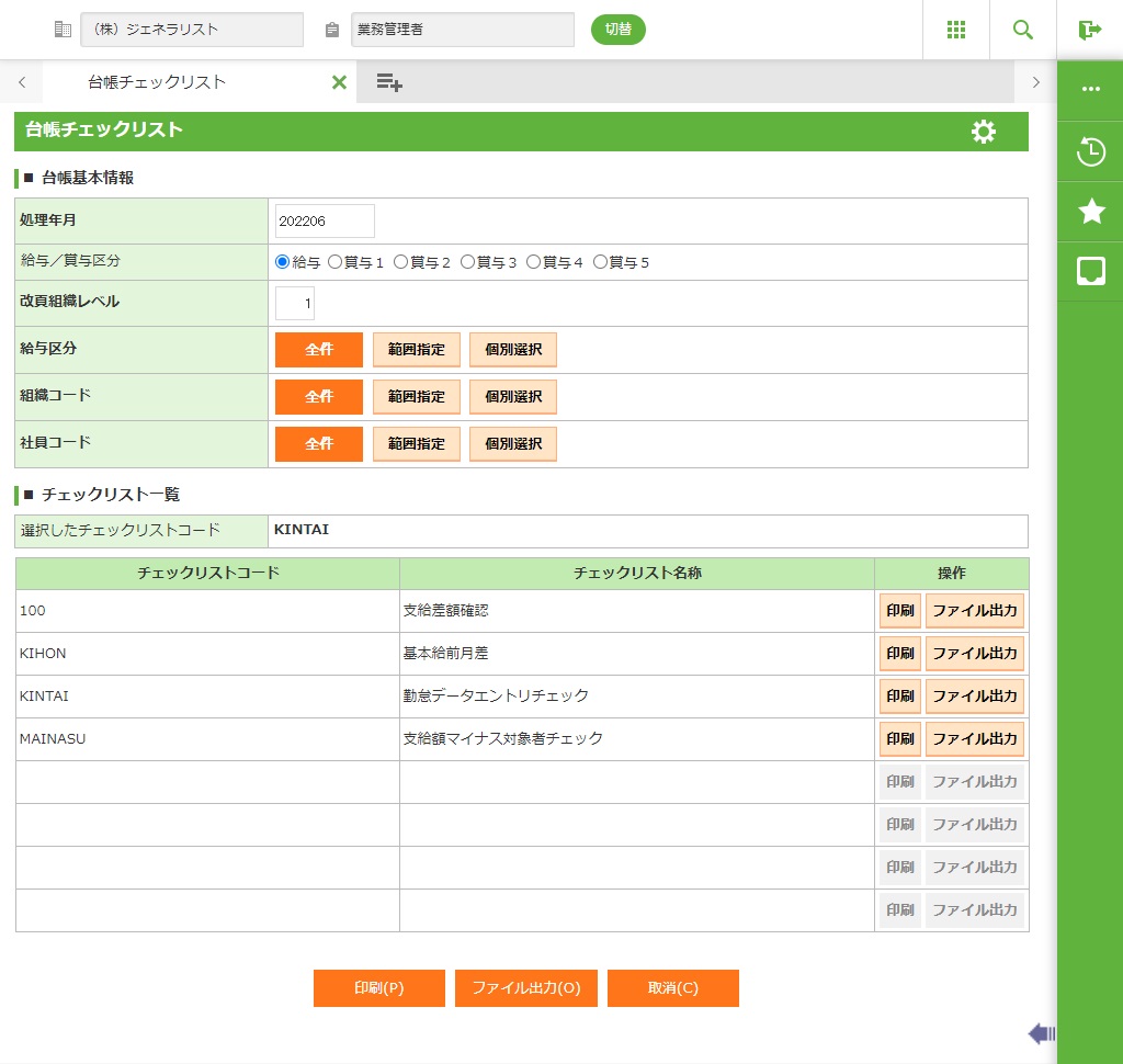 台帳チェックリストを出力して台帳情報の内容を確認してください。このリストは給与・賞与計算前でも台帳情報の内容を参照出力します。勤怠データなど計算前に変動データ内容を確認するためのリストです。