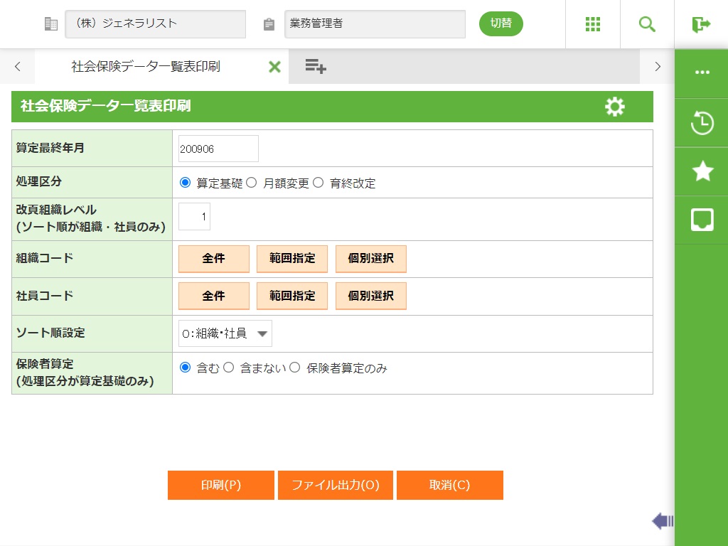 選択されたソート順で出力します。 選択できるソート順は、「組織・社員」、「社員」、「健保証番号」の3つです。 初期値は、組織・社員コード順で表示します。 |