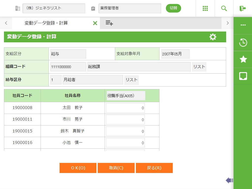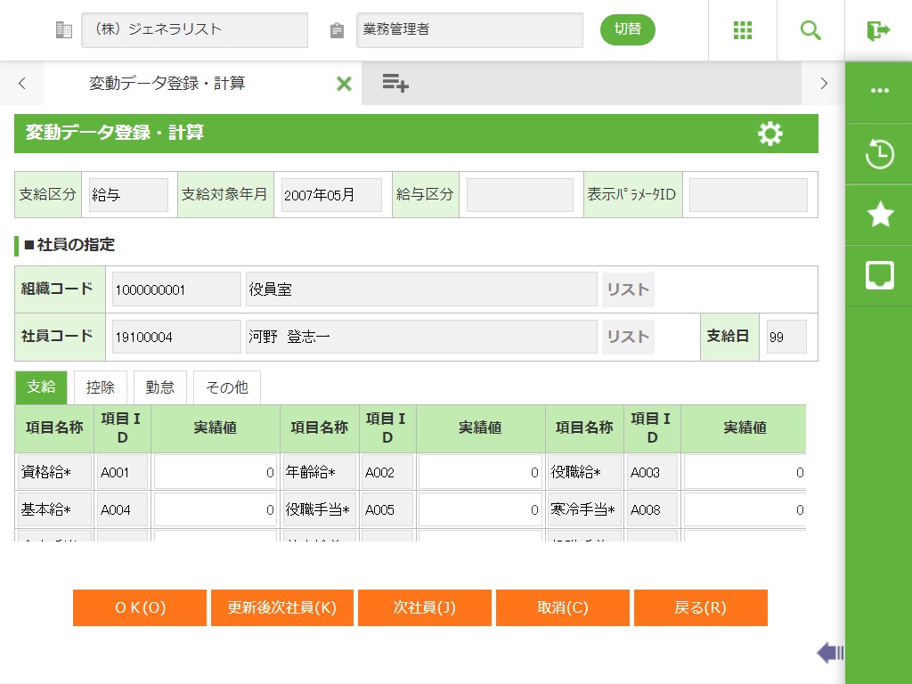 一覧型では、組織・給与区分(月例者、日給者など)ごとに一覧形式で入力します。給与・賞与計算は実行されません。