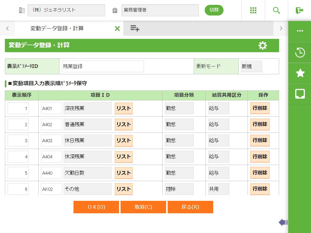 ・ 項目計算式定義マスタ設定で、使用区分(固定、変動、計算)が登録されている項目のみ保存できます。