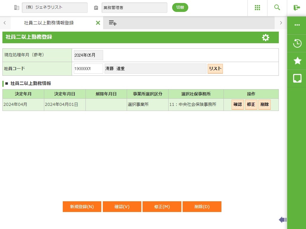 二以上事業所勤務者(二以上の事業所に勤務し、それぞれの事業所で社会保険が適用される社員)の登録を行います。決定年月日で改定を登録します。