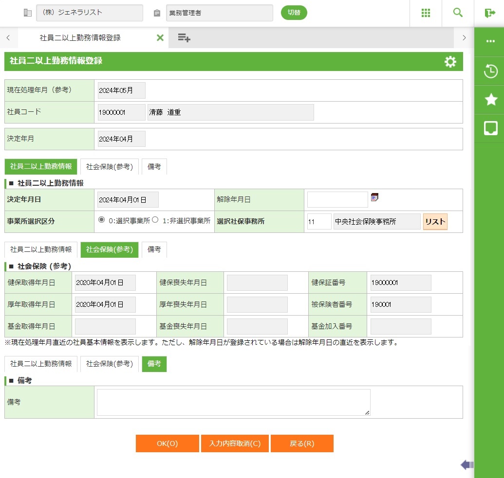・ 備考に登録した内容は「3.5.39 二以上勤務者チェックリスト」に出力します。