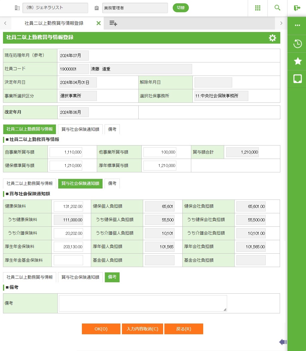 ・ 備考に登録した内容は「3.5.39 二以上勤務者チェックリスト」に出力します。