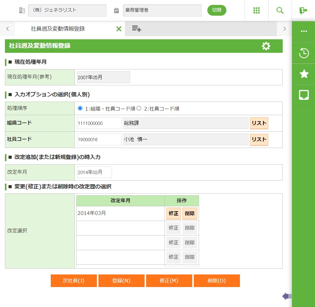 組織コード別の社員コード順か、または社員コード順で個人別に改定年月を指定して登録します。