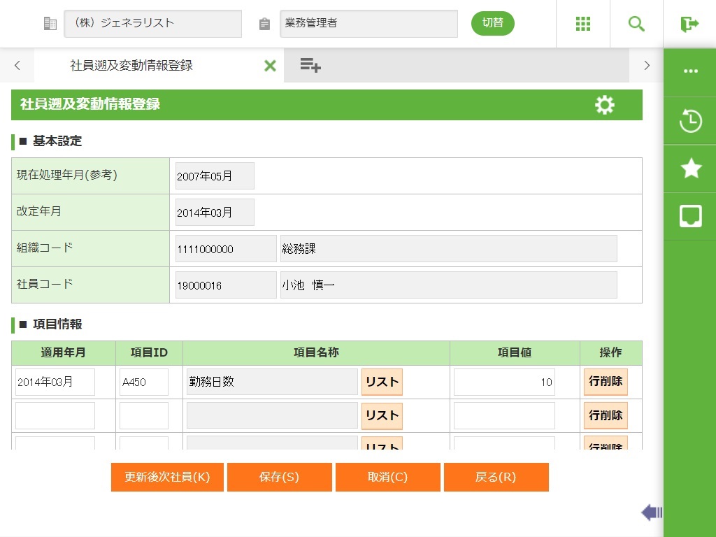 過去の給与計算における変動項目(勤怠情報など)を、当月から遡って訂正し再計算するための社員遡及変動情報(テーブル)の改定に関する登録、修正、削除を行います。