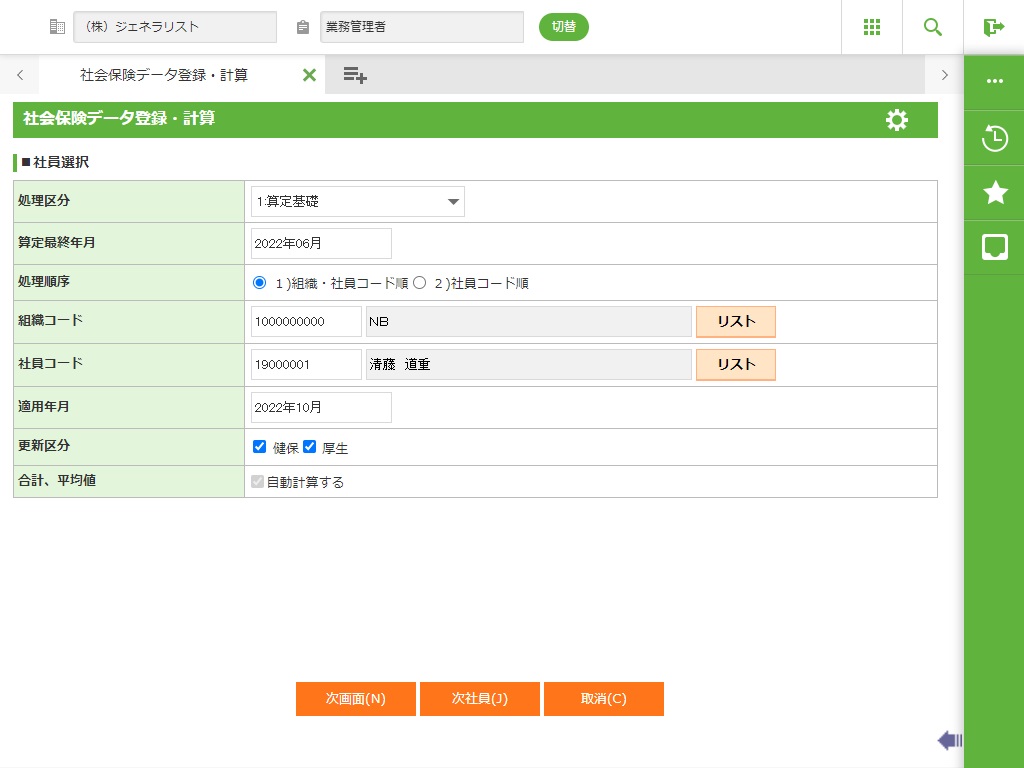 保険者算定をはじめとする例外的な算定や月変を行う場合、または定時・月変一括計算及び保険者算定処理で作成された内容の変更・取消を行う場合に入力します。