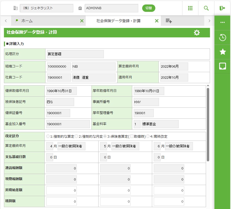 本システム導入3ヵ月以内に月額変更者が発生した場合は、この社会保険データ登録・計算で処理を行います。