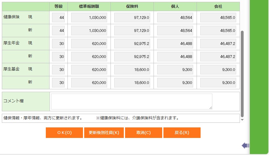 社員保険料情報(テーブル)に登録済の健保年金区分「1:健保」のコメントがあれば表示します。 | 社員保険料情報(テーブル)の健保年金区分「1:健保、2:厚年」のコメントを更新します。 |