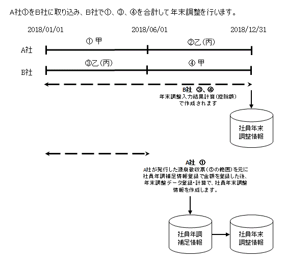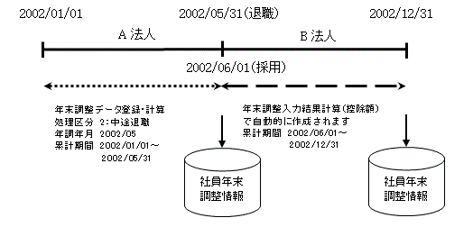 法人別システム管理マスタにて法人管理区分が“1法人タイプ”に設定している場合で年内に法人間の異動を行った社員に対して、異動先会社での年末調整処理を行うために、累計値を該当年の何月何日以降から集計するかを設定することにより、指定された日以降のデータを累計し年末調整計算処理を行います。