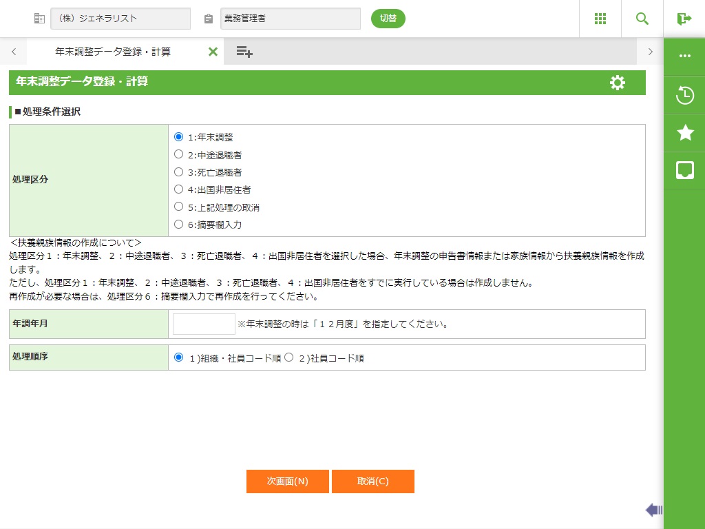 処理区分:1年末調整を選択します。該当年の年末調整を完了したい場合は、必ず処理対象年月は12月を指定してください。