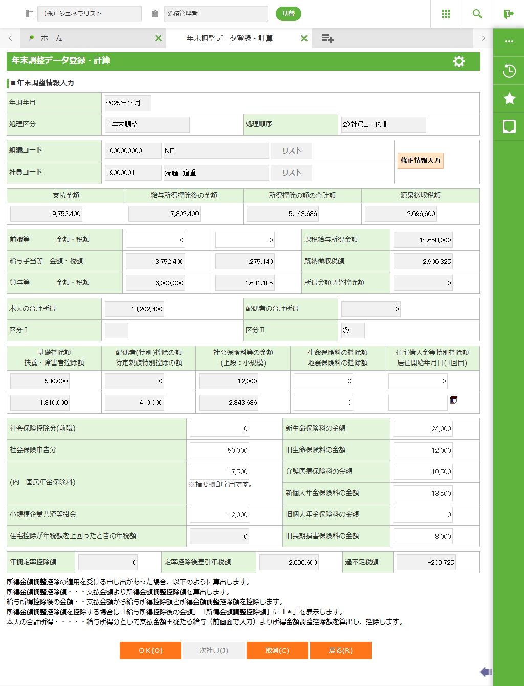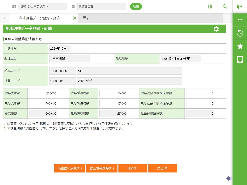 控除金額を直接修正したい場合の入力処理です。(即時年調計算を行います。)年末調整データ登録・計算で設定した保険料等の金額は、申告書に反映されません。社員年末調整情報の個別メンテナンス&個別計算を行うための機能です。従って、年の途中で退職した社員や、国内非居住の社員、死亡退職した社員などのような場合にのみ使用する機能になっています。