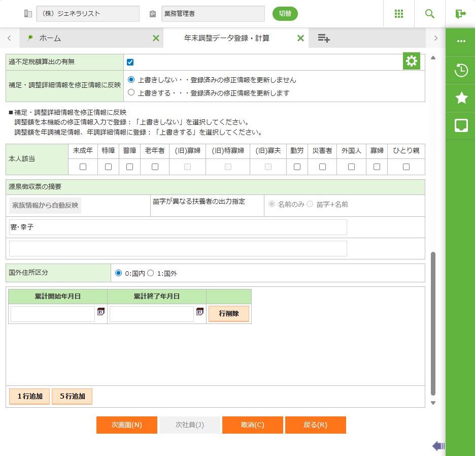 ・累計開始年月日、累計終了年月日を入力すると、この期間の台帳データと年調調整詳細情報が累計されます。