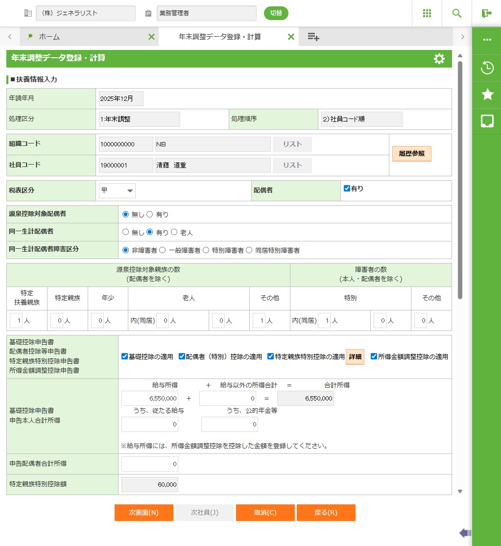 ・ 年末調整データ登録・計算で源泉控除対象配偶者や扶養親族の数など、控除額計算の元となる社員扶養情報データを変更すると、年末調整計算だけではなく給与計算/賞与計算にも影響しますので注意してください。