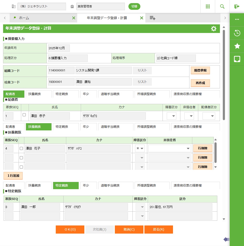 社員源泉特親情報を申告書情報または家族情報から作成し、表示します。 |