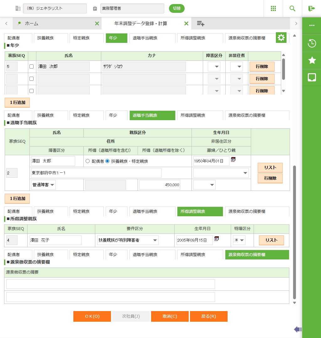 社員源泉親族情報/社員源泉年少情報を申告書情報または家族情報から作成し、表示します。 |