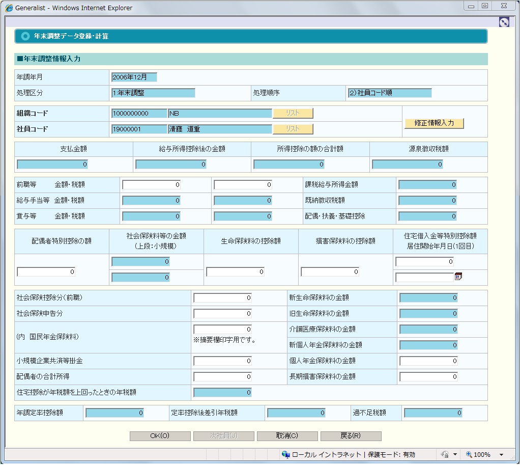 表示されている内容を保存した後画面−2へ戻り、次の社員コードのレコードを表示します。 「処理順序」が“1”の場合、表示されている組織に所属する次の社員を検索・表示します。“2”の場合、次の社員を表示します。 |