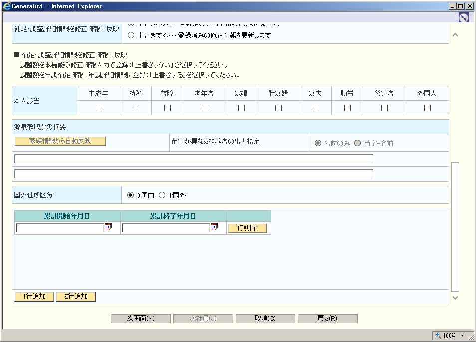 ・ 入力された年調年月が2016年1月以降の場合、「家族情報から自動反映」ボタン、「苗字が異なる扶養者の出力指定」ボタンが使用不可になります。