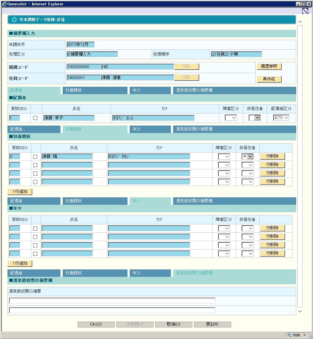 申告書情報または家族情報から社員源泉親族/年少情報を作成し表示します。 |
