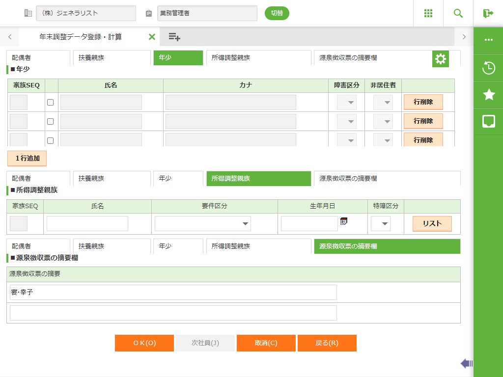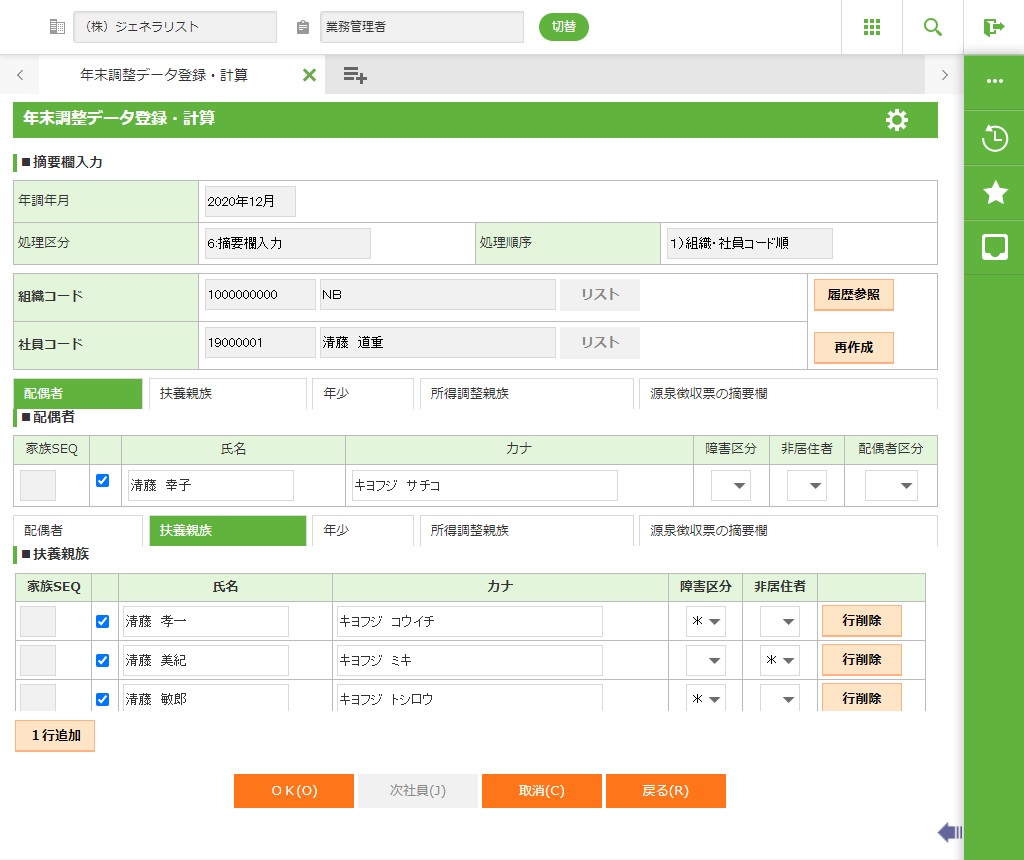 申告書情報または家族情報から社員源泉親族/年少情報を作成し表示します。 |