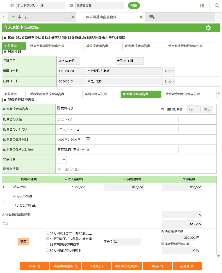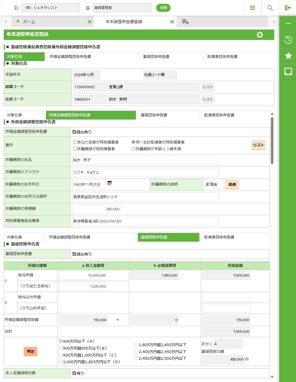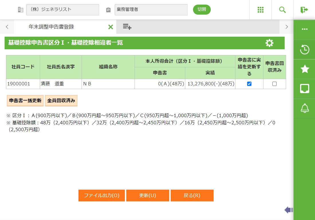 年末調整計算後の本人所得合計の実績値区分と基礎控除額が表示されます。 |