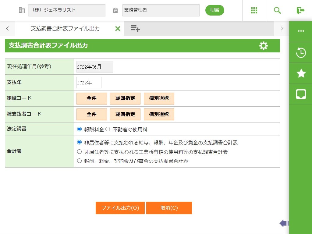 法定調書で1:報酬料金を選択した場合、選択可能とします。 「非居住者等に支払われる給与、報酬、年金及び賞金の支払調書合計表」、「非居住者等に支払われる工業所有権の使用料等の支払調書合計表」、「報酬、料金、契約金及び賞金の支払調書合計表」 から選択します。 |