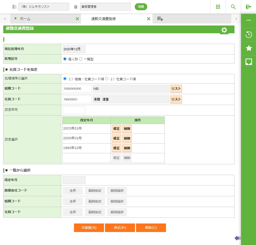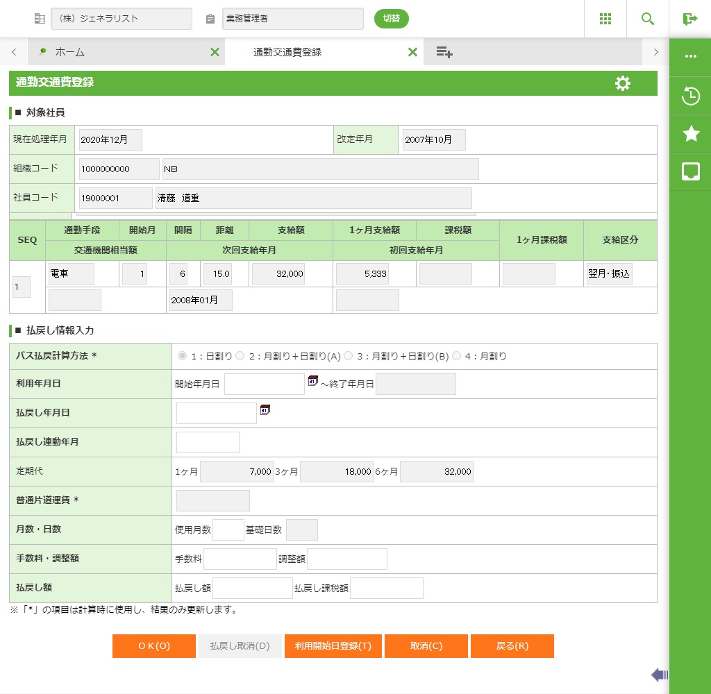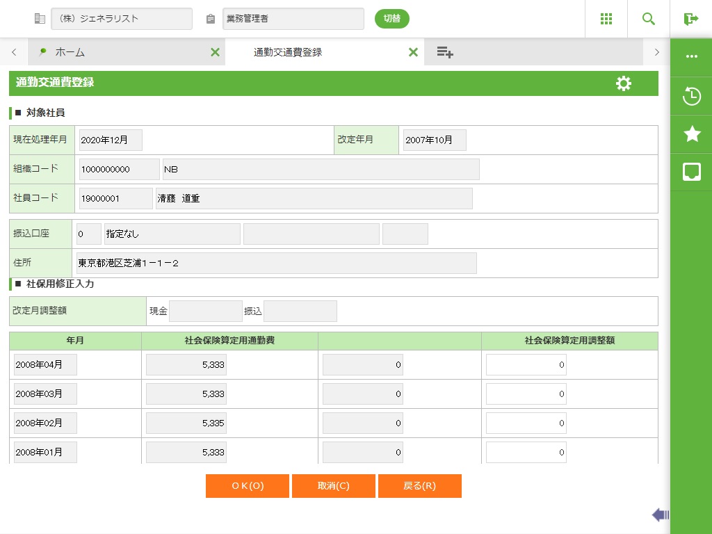 社会保険算定用通勤費が表示されます。 未来年月…改定年月+6ヶ月 過去年月…改定年月より−1年間 |