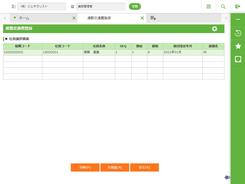 SEQ、通勤手段、月、間隔、距離、支給額、課税額、支払区分、交通機関相当額、次回支給年月、初回支給年月が表示されます。 |