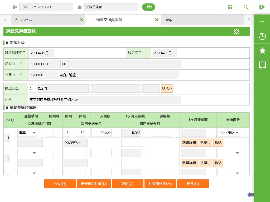通勤交通費登録のあと、各種データ台帳一括取込を行うことにより、通勤費の台帳情報を更新します。