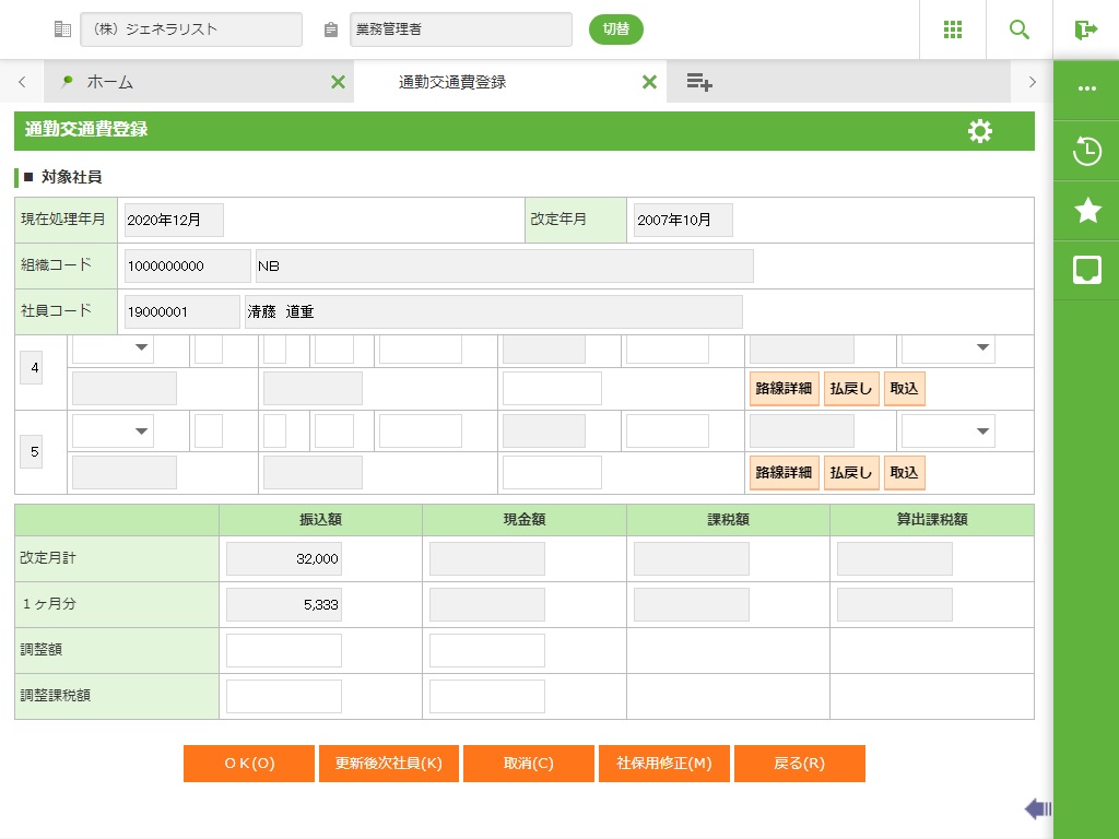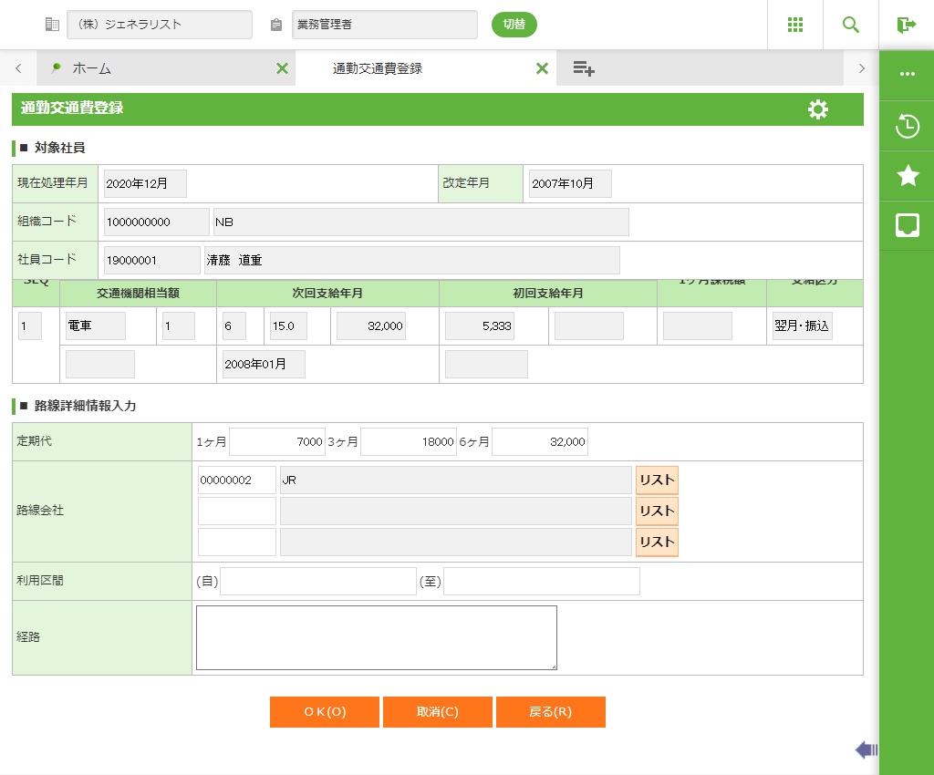 ・ 路線詳細入力にて入力や修正を行った場合は、画面−3の通勤交通費情報登録画面でも「OK」ボタンを押下し、保存してください。