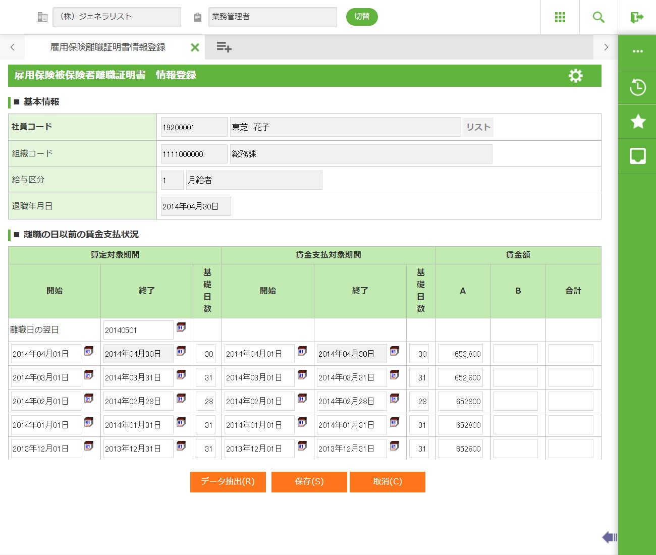 ・ 社員雇用保険離職日情報および社員雇用保険離職証明書情報のデータを表示します。