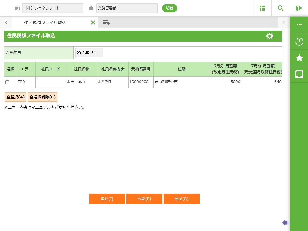 住民税額ファイル取込 修正画面にて選択をチェックし、対象となる社員の社員コードを入力してから取込を行ってください。