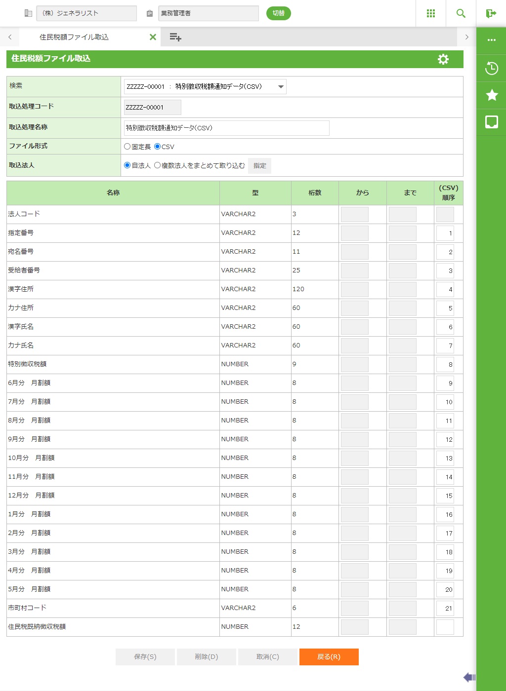 住民税額ファイル取込(6月、7月のみ)【法人設定】 【ファイルレイアウト】 【サンプルファイル】