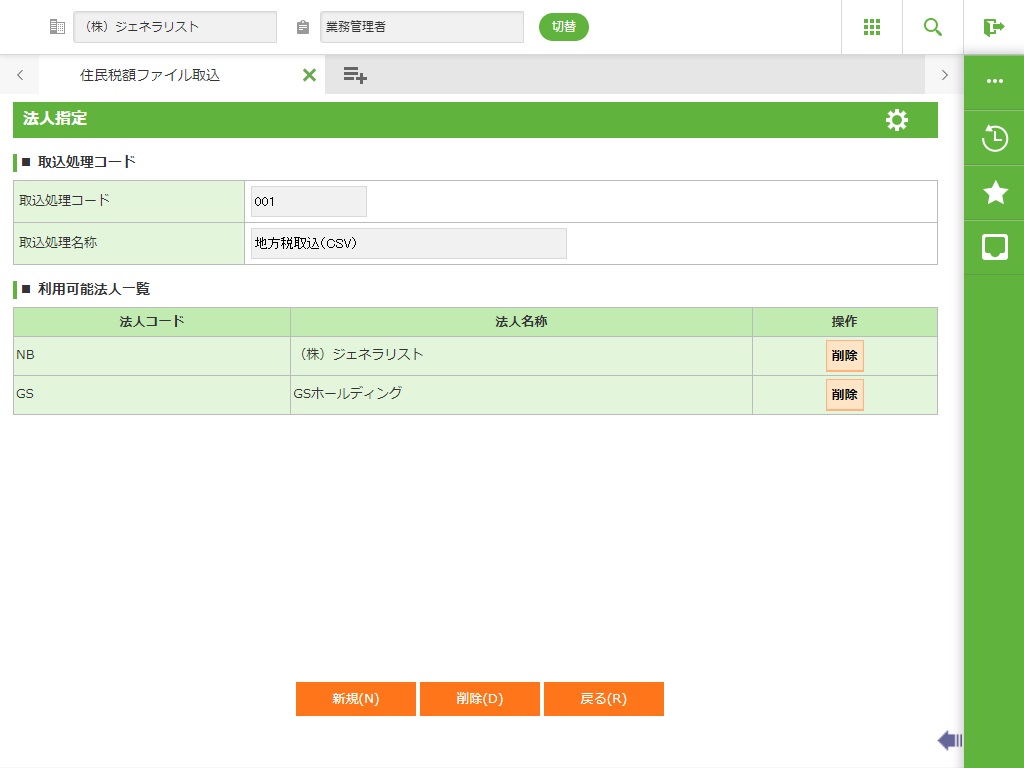 ・ 住民税額ファイル取込を行う法人を設定します。