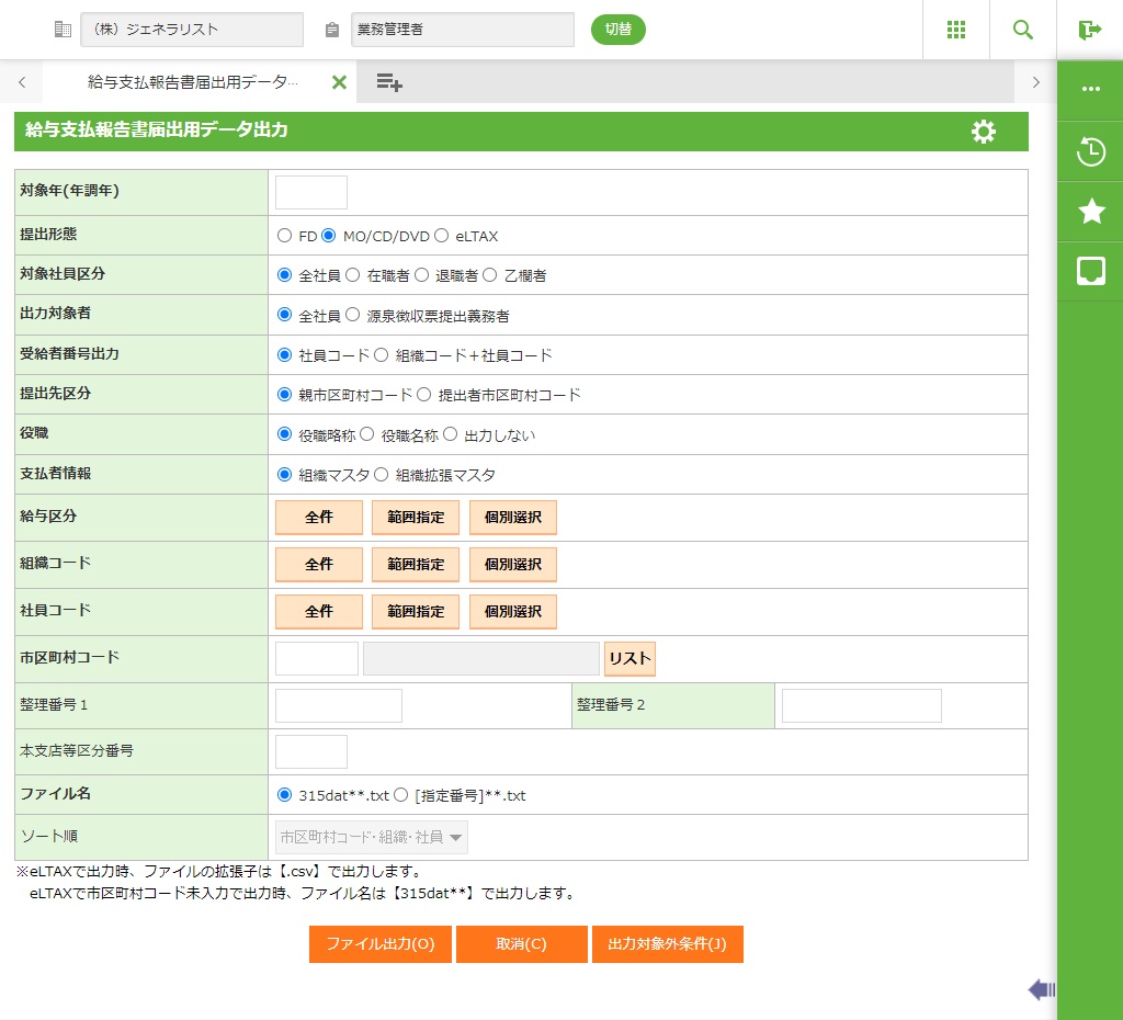 3.6.28.1 給与支払報告書届出用データ出力画面