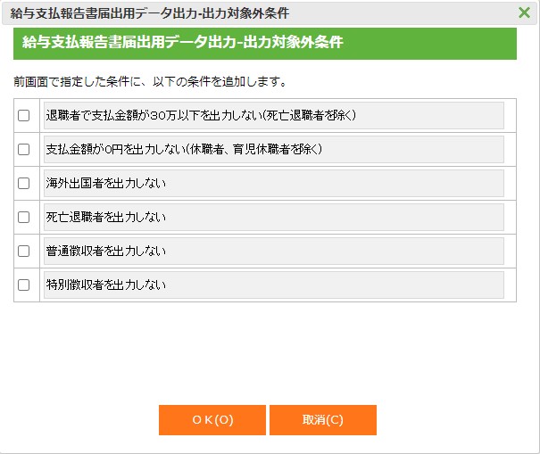・ 年調年に関わらず、以下の条件に当てはまる場合は、エラーファイルを出力します。エラーとなっている社員は、給与支払報告書データのテキストファイルには出力されません。
