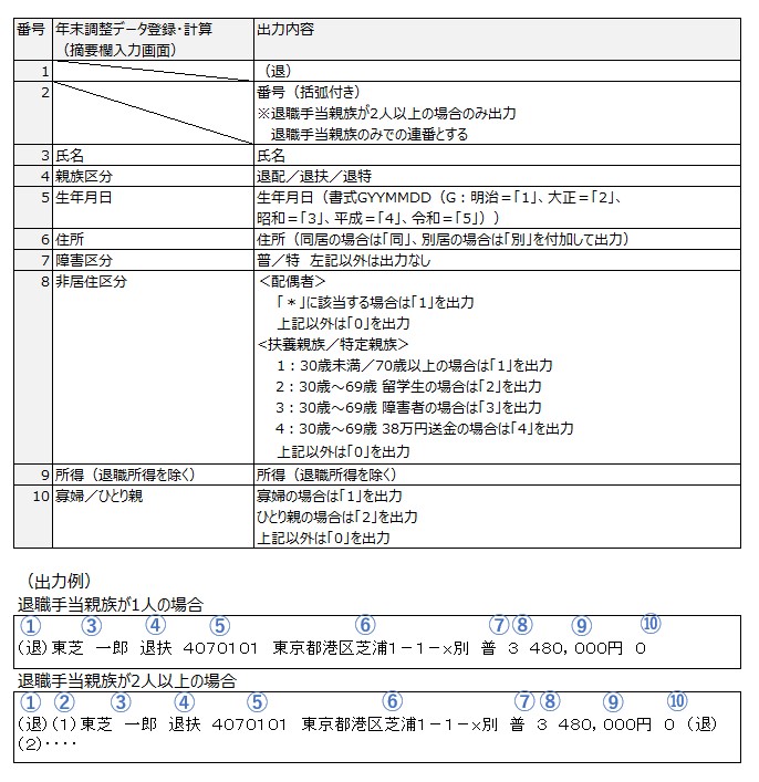 ・項番86:摘要に出力される「扶養親族・特定親族の5人目〜9人目」、「退職手当等を有する配偶者・扶養親族・特定親族」については、制限文字数を超えた分は出力されませんが、項番132:5 人目以降の控除対象扶養親族等の個人番号、項番133:5 人目以降の16 歳未満の扶養親族の個人番号については、「扶養親族・特定親族の5人目〜10人目」の個人番号、「退職手当等を有する配偶者・扶養親族・特定親族」の個人番号が全て出力されます。そのため、項番86:摘要に出力されていない「扶養親族・特定親族」、「退職手当等を有する配偶者・扶養親族・特定親族」の個人番号が項番132、項番:133に出力される場合もあります。項番86:摘要欄の制限文字数を超えた分については、出力されるエラーファイルで確認できます。