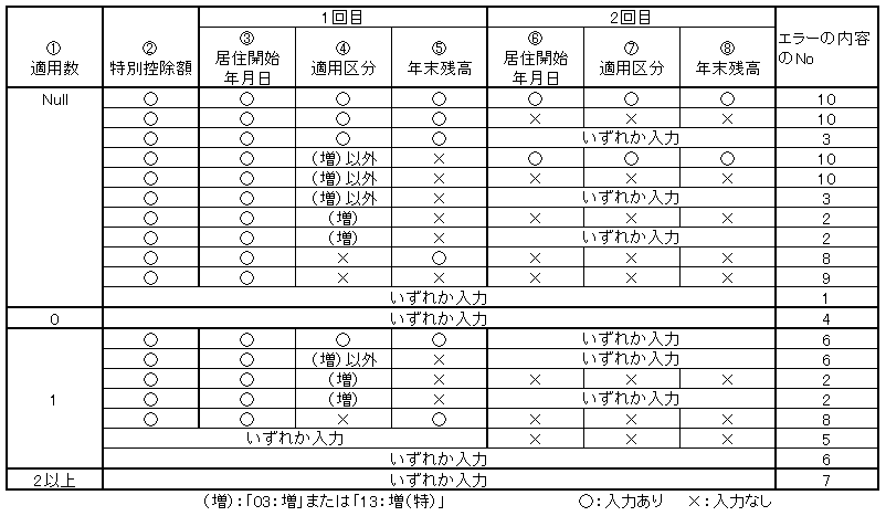 住借控除適用数が「未設定(Null)」または住借控除適用数が「1」で住借控除額、居住開始年月日に登録があり、区分の登録がなく残高の登録がある場合 |