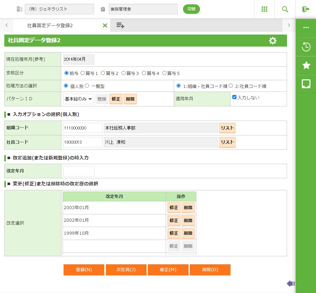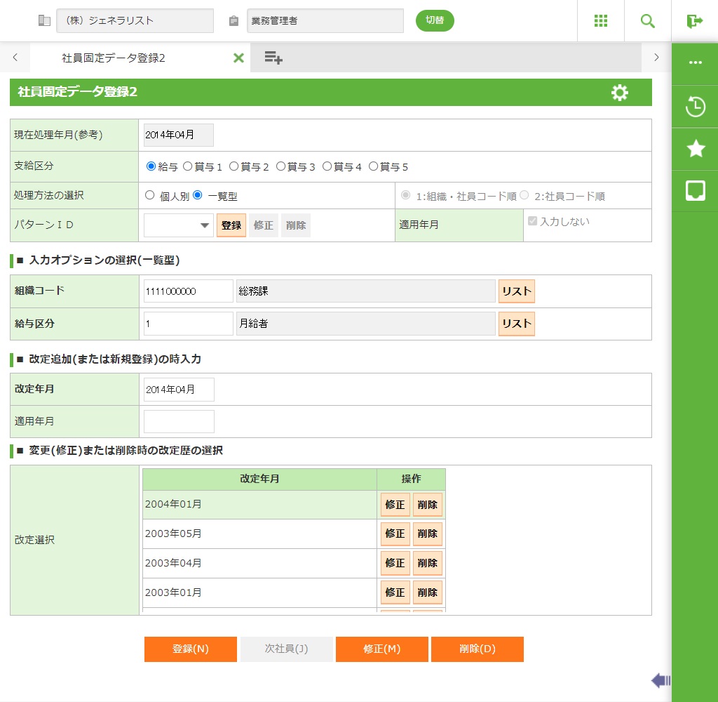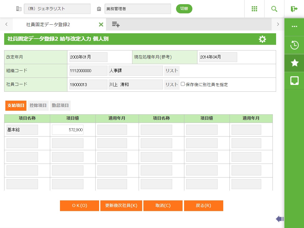 給与・賞与の固定項目(基本給、諸手当など)に改定が発生した場合に、改定情報の追加を行います。現在処理年月を参照して現在処理年月時点でのマスタを参照します。