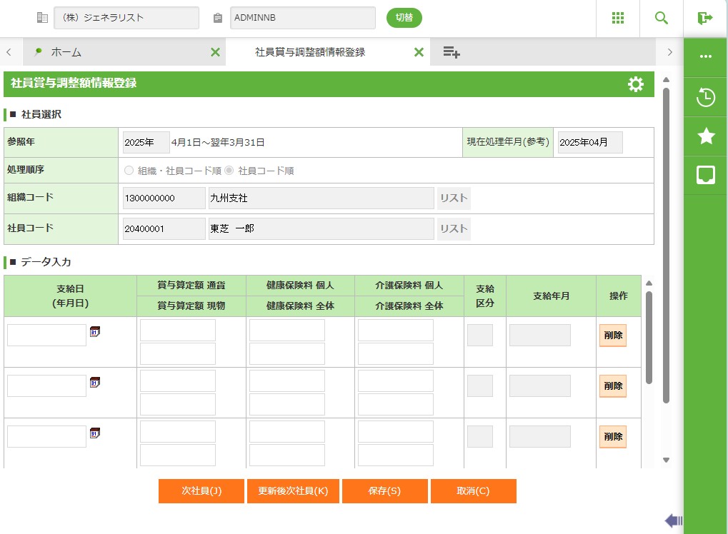 社員ごとに支給日(年月日)、標準賞与算定額通貨/現物(健康保険料個人/全体、介護保険料個人/全体)を入力します。