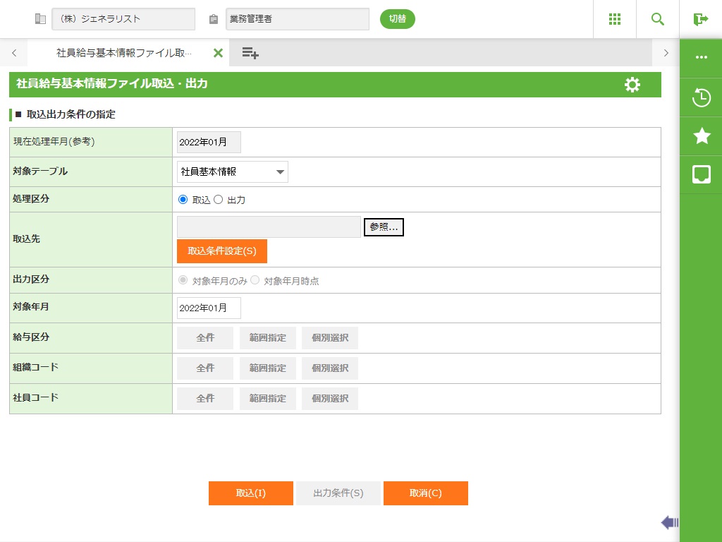 給与の基本テーブルのファイルからの取込/ファイルからの出力を行います。