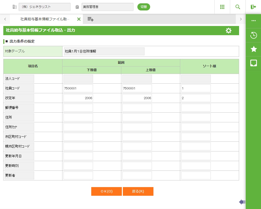 3.1.12.2 社員給与基本情報ファイル取込・出力画面−2 出力条件画面