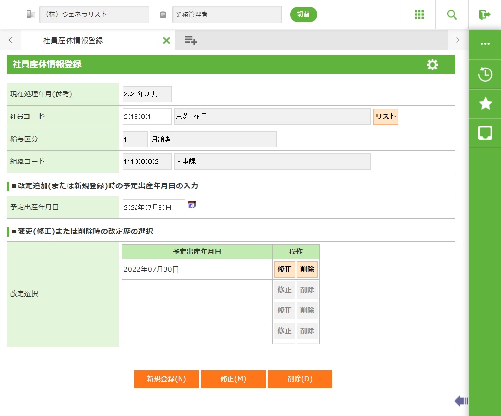 社員産休情報の登録を行います。予定出産年月日で改定を登録します。