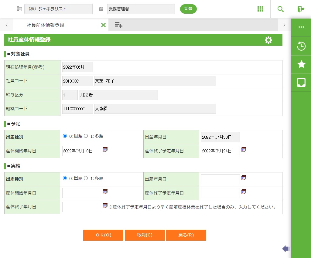 本機能で必要な出産年月日、産休開始年月日、産休終了予定年月日などの社員産休情報を登録します。