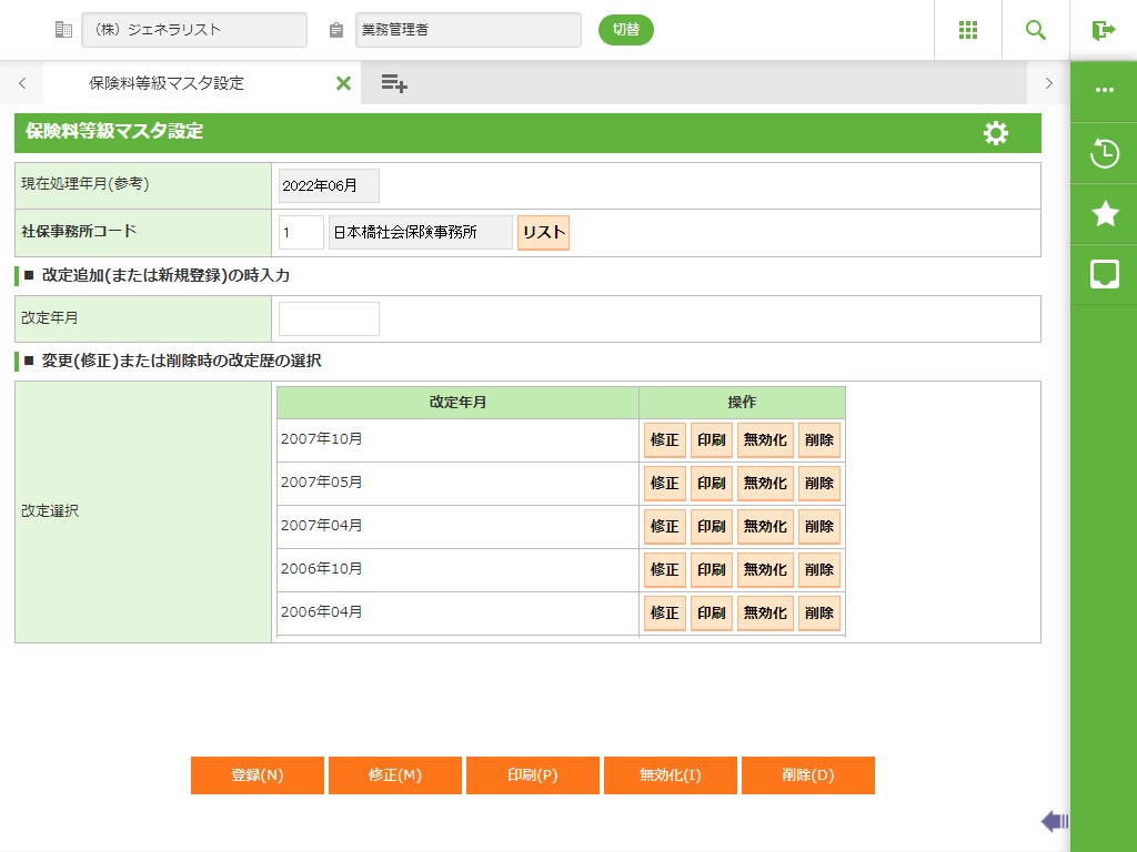 | 印刷(P) | 選択した改定年月の等級マスタリストを印刷します。 |