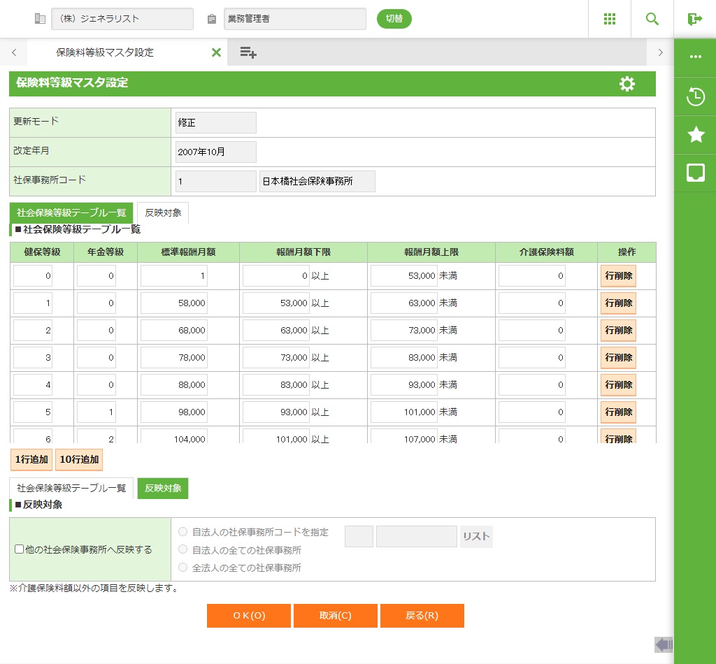 健康保険・厚生年金の等級および標準報酬月額を社会保険事務所ごとに設定します。