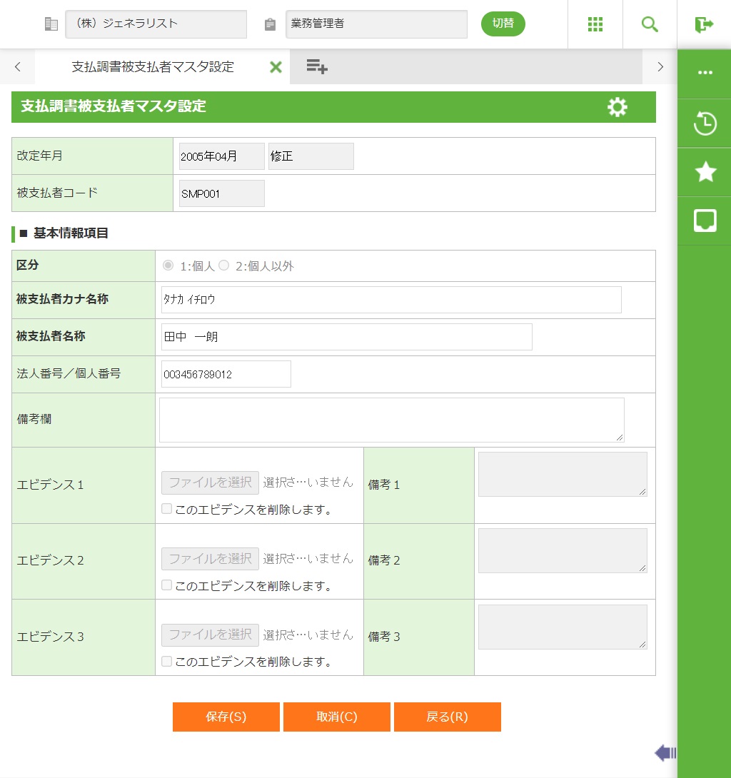 ・ 被支払者が個人(区分が「1:個人」)の場合、個人番号の登録を行うには、「業務グループ設定)(1.1.16)」で個人番号取扱権限が実行可能に設定されている必要があります。 個人番号取扱権限がない場合、個人番号の登録はできません。 法人番号/個人番号は「*」、備考欄、エビデンス1〜3、備考1〜3は空白で表示されます。 また、法人番号/個人番号、備考欄、エビデンス1〜3、備考1〜3は無効化され、入力できません。
