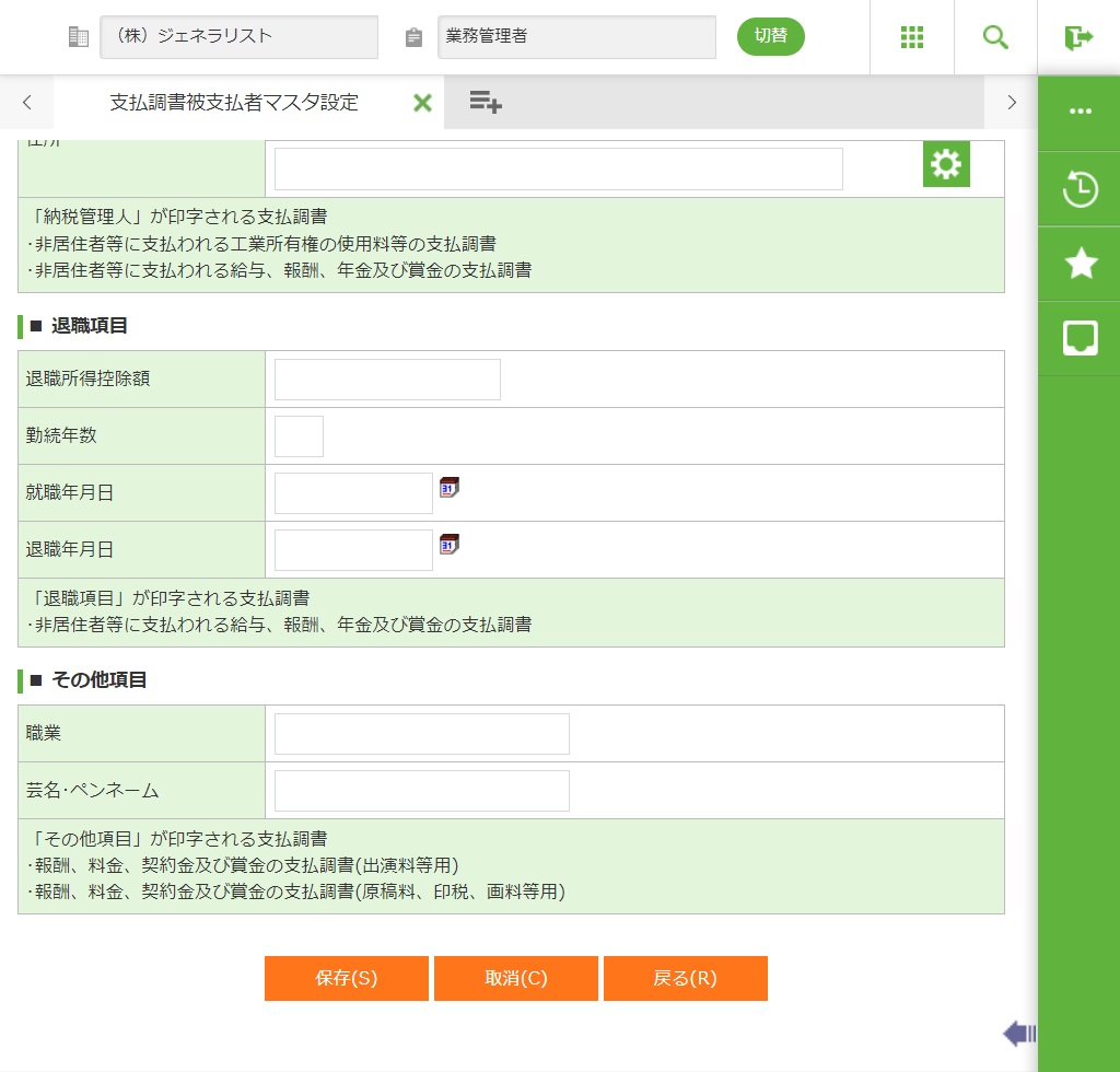 フィールド(支払調書に印字される被支払者情報)