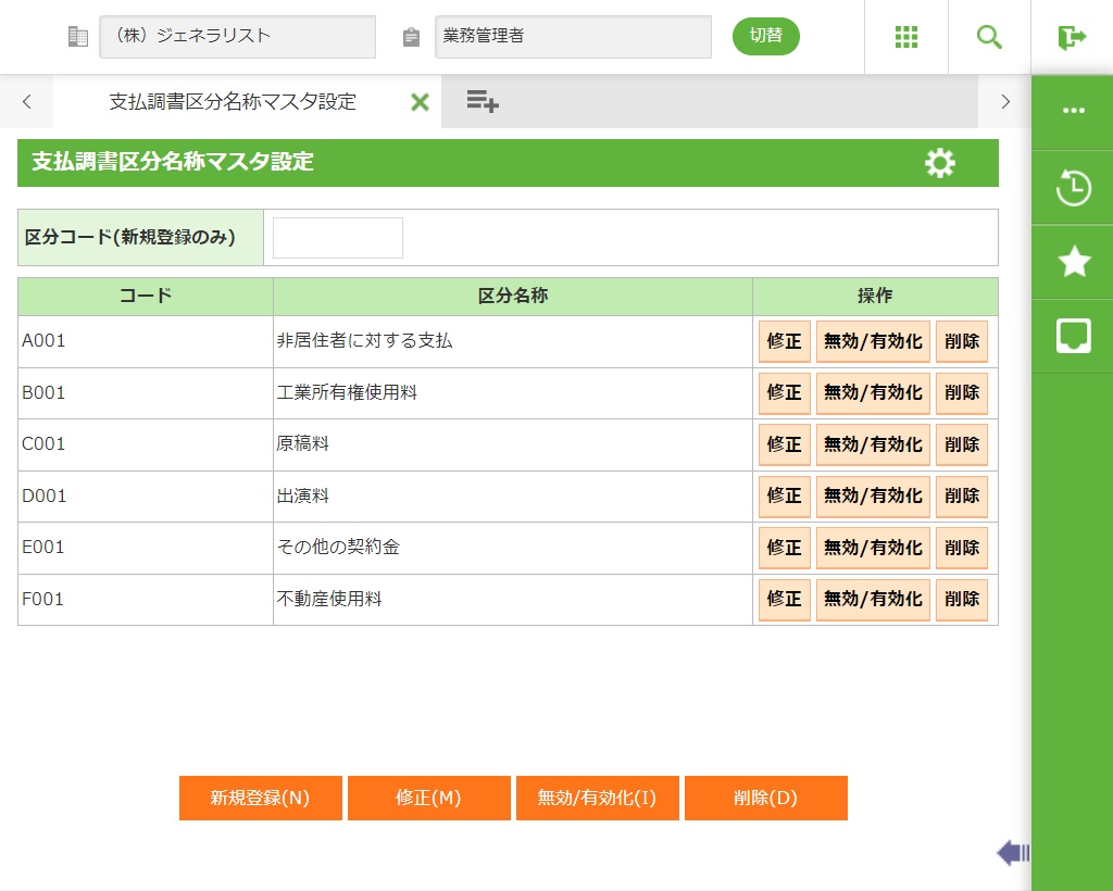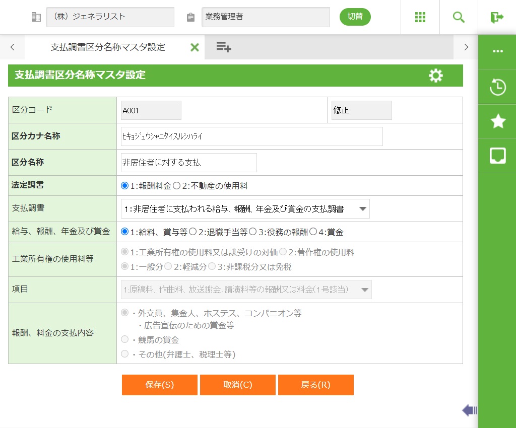 支払調書の種類を判別するための区分を登録、修正、削除します。