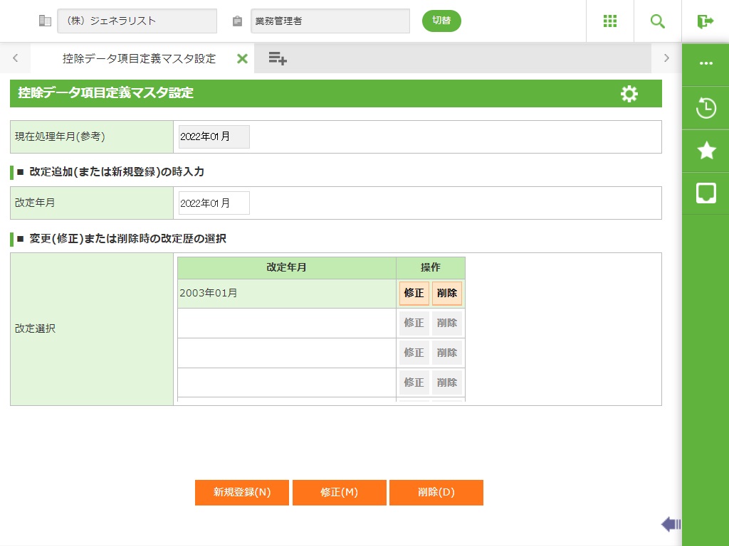 新規登録時は、改定年月を西暦6桁または和暦5桁(元号は和暦省略入力記号(アルファベット1文字))で入力します。 |