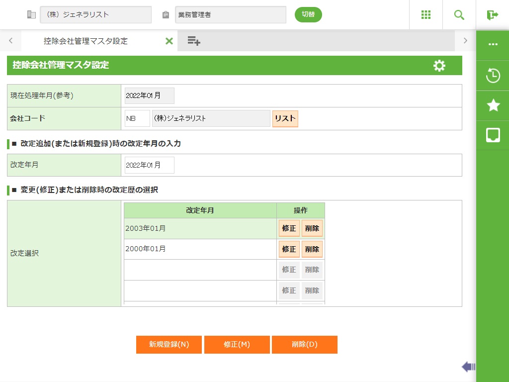 新規登録時は、改定年月を西暦6桁または和暦5桁(元号は和暦省略入力記号(アルファベット1文字))で入力します。 |